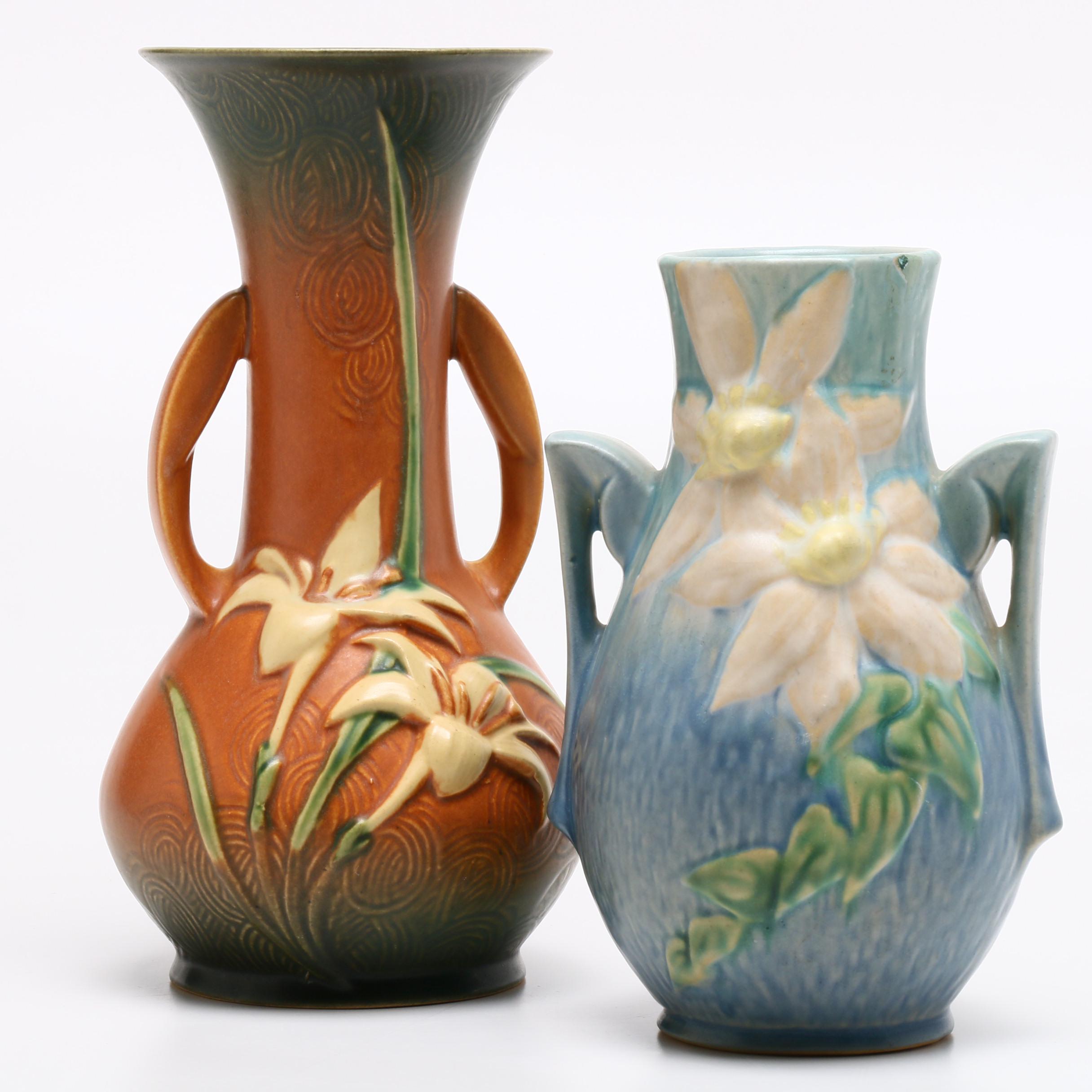 Roseville Pottery Clematis And Water Lily Vases 1940s Ebth